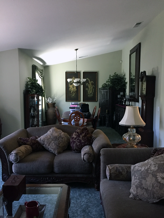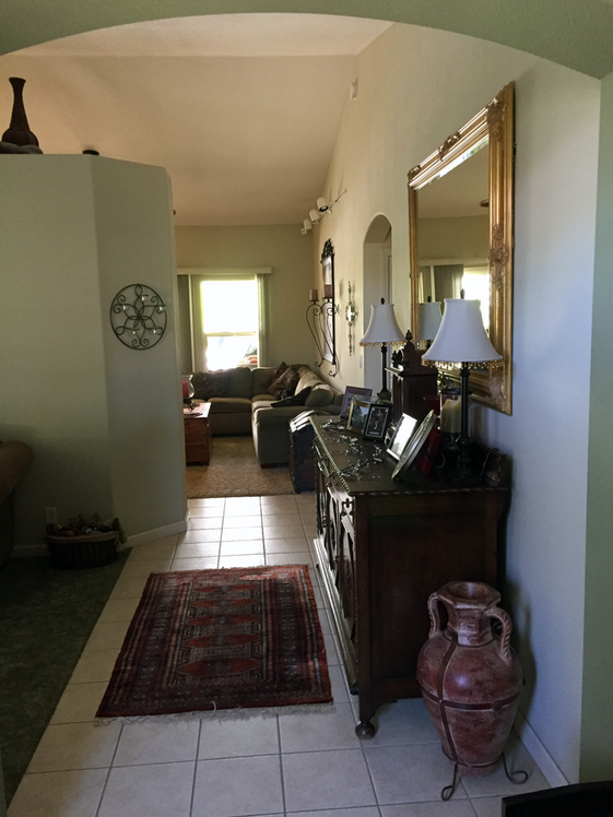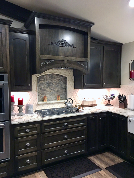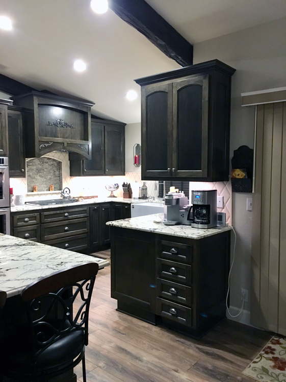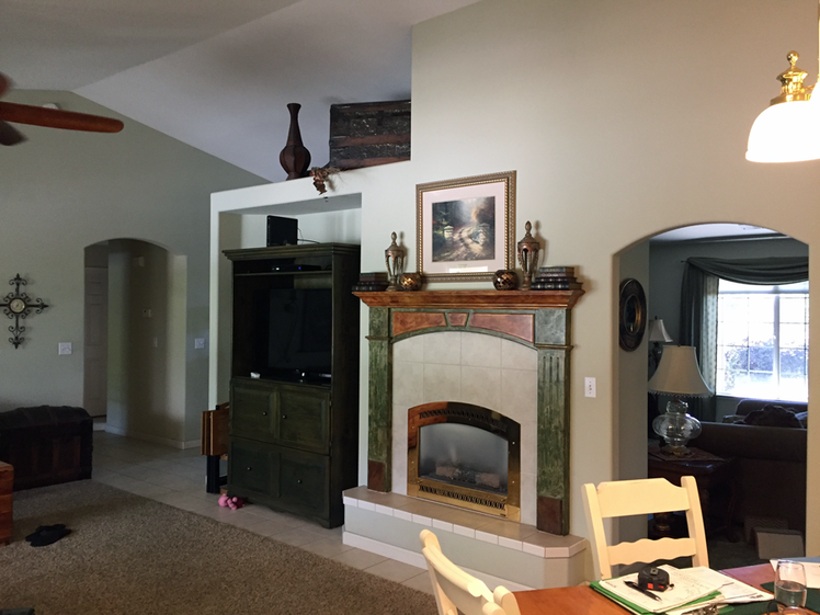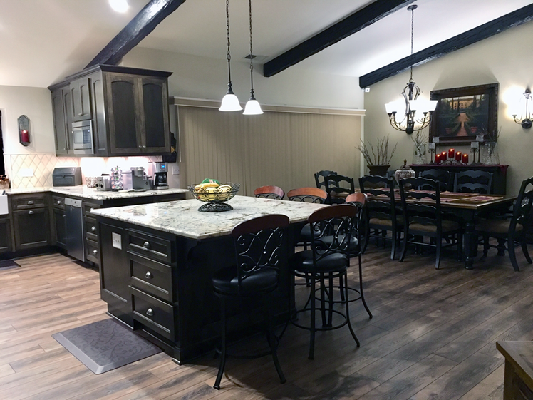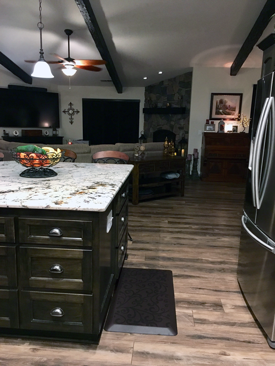 Significant remodel of four spaces originally separated by a wall and fireplace resulting in an expansive and truly Great Room suited to large gatherings as well as inviting dinners and family movie nights. The use of the space(s) was reimagined and rearranged including new access to an existing recreation room through a new arched doorway/hall with a curved niche. A new corner fireplace with stone facing anchors the new Living /Family Room. The Mediterranean-inspired aesthetic shows in the added beams, lighting fixture choices, the glass and scroll-work walk-in pantry door, light granite with earth-tone veining, and the deep, warm tones of the cabinetry, flooring, and furnishings. The kitchen now boasts a large island with ample seating, double wall ovens, built-in microwave, apronfront sink, and pull-out storage. Subtle arch details are repeated in wall niches and doorways.