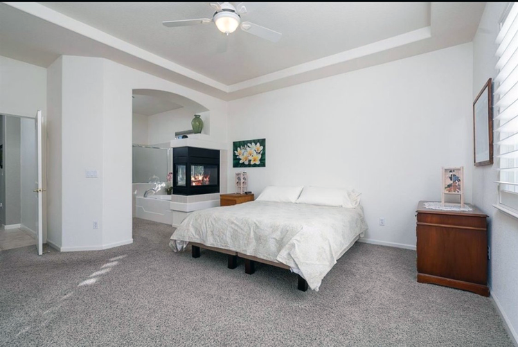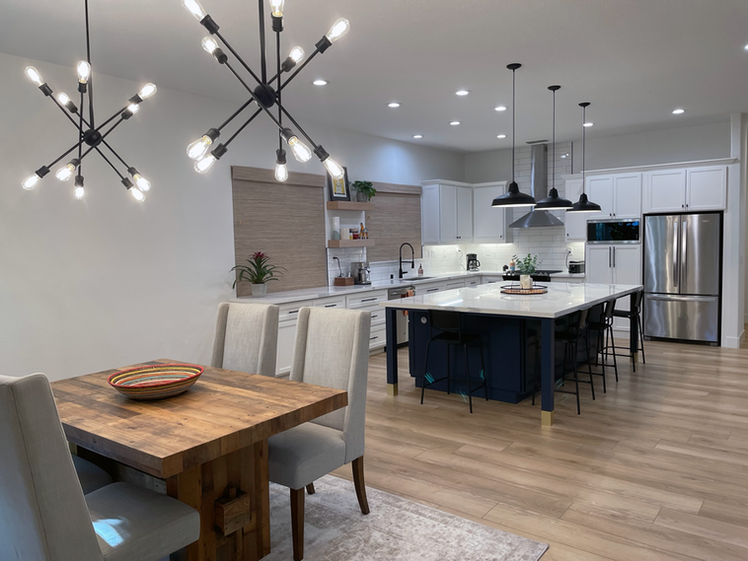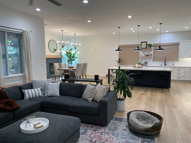 Dramatic great room remodel including living room, dining room, and kitchen. Walls removed and ceiling recess leveled, fireplace added along with built-ins, family room converted to dining room with dual chandeliers and dry bar. Primary bathroom remodeled, powder room and guest bathrooms renovated. New luxury vinyl plank flooring throughout.